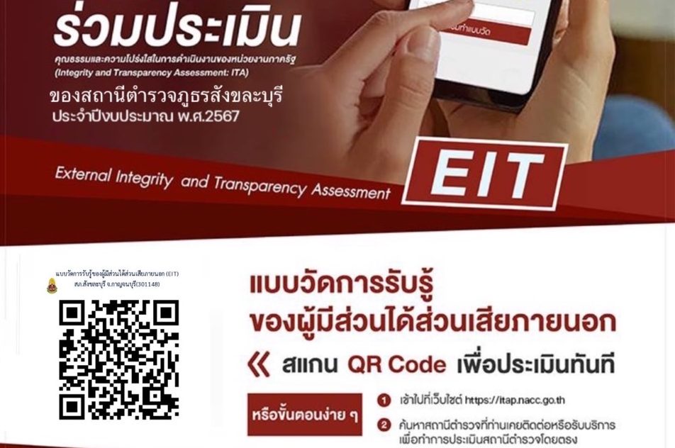 ขอเชิญผู้มารับบริการหรือมาติดต่อราชการร่วมประเมินคุณธรรมและความโปร่งใสในการดำเนินงานของหน่วยงานภาครัฐ (Integrity and Transparency Assessment : ITA) ประจำปีงบประมาณ พ.ศ. 2567 ของสถานีตำรวจภูธรสังขละบุรี ประจำปีงบประมาณ พ.ศ. 2567