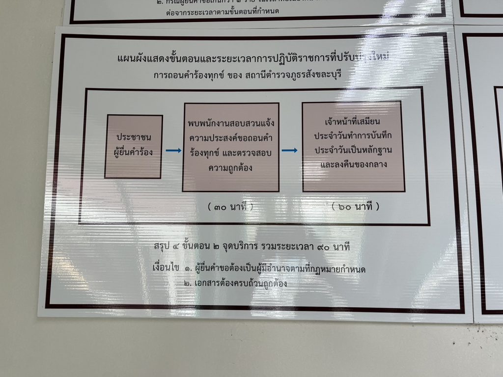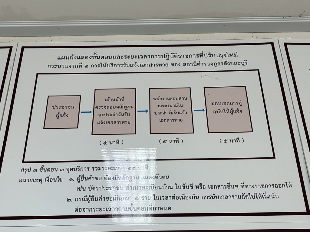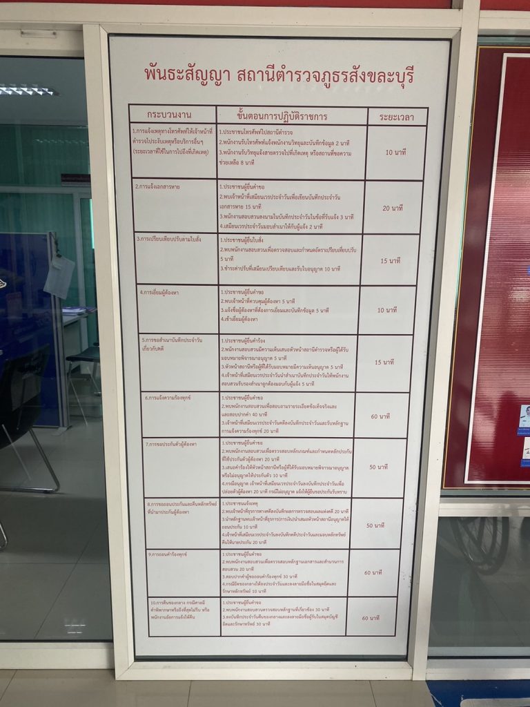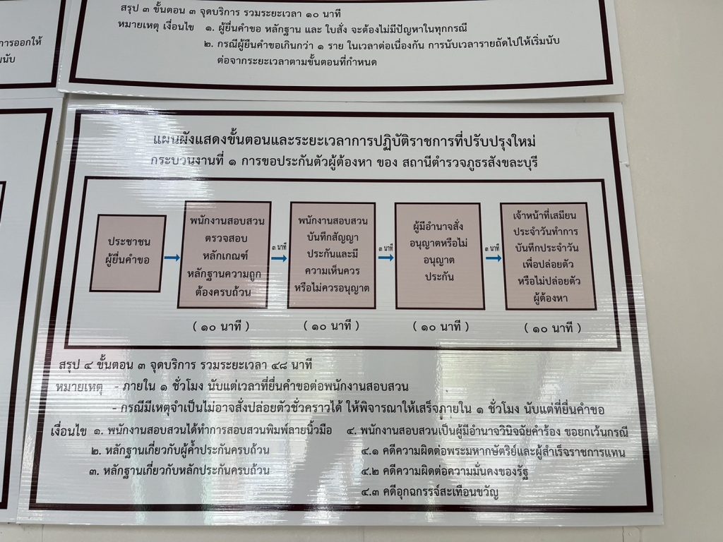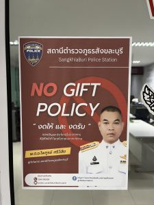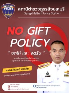 ติดไว้ในจุด บริการของสถานี เพื่อให้ประชาชนทราบว่า หน่วยงานประกาศว่าเจ้าหน้าที่ทุกคนในสังกัดไม่รับของขวัญหรือของกำนัลจากการปฏิบัติหน้าที่ และต่อต้านการรับสินบน โดย มี พ.ต.อ.ไพฑูรย์ ศรีวิลัย ผกก.สภ.สังขละบุรี หัวหน้าหน่วยงานเป็นผู้ประกาศ