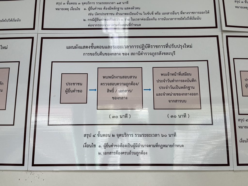 การกำหนดกรอบกิจกรรมการปฏิบัติงานของสถานีตำรวจภายใต้ระบบการทำงานและทรัพยากรที่มีอยู่ในแต่ละพื้นที่เพื่อ กำหนดเป็นพันธะสัญญาให้บริการ โดยแสดงขั้นตอนและระยะเวลาของการให้บริการของสถานีตำรวจที่ผู้มาใช้บริการควรทราบ